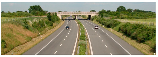 The review of the literature (Section 1) reveals a lack of studies in which an interdisciplinary approach was applied, which, besides giving the land planners the principles of design of individual crossing structures, taking account of the need to ensure continuity of landscapes and habitats, would also discuss the aspects of sustainable development of the wildlife crossing areas to enhance wildlife movements and extend the knowledge on the spreading of noise, exhaust fumes and pollution around these structures. The available studies concern primarily ecological issues (i.e., factors ensuring the continuity of landscapes and biotopes) [1,2,3]; construction, structural and economic aspects [17,19,20,21]; selection of plant species [16,20] and the results of studies on the width and openness of the crossing structures conducted in France [25], Switzerland [26], the USA [27,28,29], and Sweden [30].