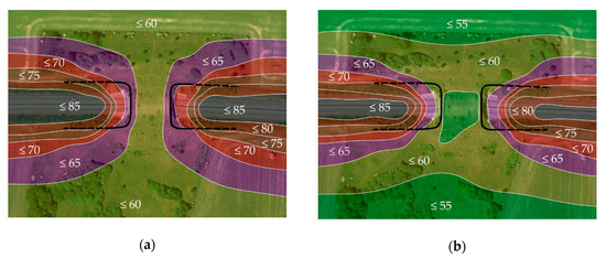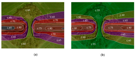 Noise map of the crossing structure No. 1 plotted on a Google Earth satellite image [56]: (a) in the evening; (b) in the morning. Additional markings used on the map: solid line designates the centre line of the noise barriers and broken line designates the centreline of earthen berms. The noise levels are given in dB(A).