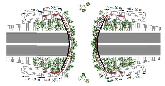 For better definitions of construction and environmental issues pertaining to the design of wildlife overpasses, their area has been divided into three zones [16,17,18,19] called “approach”, “entrance” and “deck” areas. In some guidelines [19,20,21], the approach area is called “surrounding area” and an additional term “buffer zone” was introduced by reference [22]. Conversely, in the Polish guidelines [23] and in the article [24] concerning the establishment and maintenance of roadside vegetation, the approach and entrance areas are jointly called the “attraction zone” and the “exclusion fence area” is sectioned off, in addition.