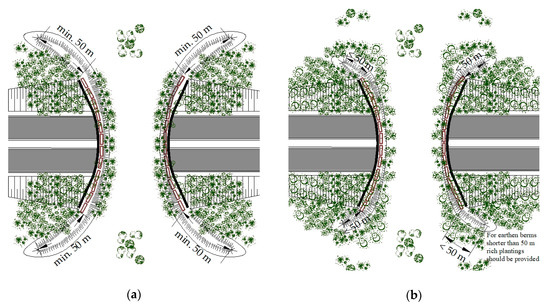 In the case of rural areas featuring a varied topography in the approach area, parabolic-shaped noise barriers should be used, continued by contiguous earthen berms of the same height (Figure 24, Figure 25 and Figure 26). On the basis of the noise analyses represented in Figure 17 and Figure 18, we can conclude that in uneven terrain parabolic-shaped noise barriers should be used, supplemented with contiguous earthen berms of the same height. The lengths of such earthen berms depend on the direction in which the terrain slopes in the approach area. Depending on the local conditions, earthen berms should be at least 50 m wide (Figure 24), deflected outwards of the crossing in a parabolic curve (Figure 25 and Figure 26a). If such a long berm is not practicable due to the local conditions, a shorter berm can be constructed, as long as the slopes of the road cutting, abutment and earthen berm are generously landscaped. When a shorter earthen berm is provided, it is suggested to plant a large sea-buckthorn (Hippophae rhamnoides) grove before the berm, on the side facing the passageway. The sea-buckthorn shrubs within a few years develop into a thick grove, providing a very effective barrier to the propagation of noise and exhaust fumes [27,28]. The sea-buckthorn shrubs are frost, drought and road pollution tolerant. Additionally, the sharp thorns effectively discourage people from entering the deck area. Both types of landscape elements and structures provided in the immediate vicinity of the green bridge encourage wildlife movements. On the green bridges represented in Figure 24 and Figure 25 roe deer (Capreolus capreolus), fallow deer (Dama dama), hares (Lepus) and hedgehogs (Erinaceus) were often observed.