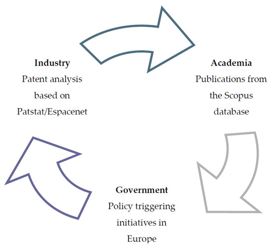 To achieve this objective, a triple-helix innovation approach is used [27], in which efforts from academia (scientific publications), the industry (patents), and the government (in the form of possible initiatives linked to future policy actions) are assessed (Figure 1). The reasoning behind this approach, is that in the case of Hyperloop, which is fundamentally a new system, it creates the need for new basic research that focuses on new processes and challenges. Likewise, as the technology becomes more mature, adequate governance needs to address it from a policy perspective, focusing on safety and accounting for other issues such as standardization and certification. The whole process is anything but linear, and several links between the three elements are possible.