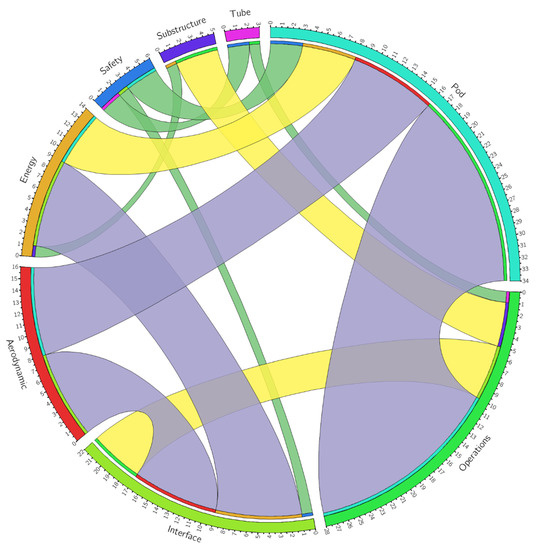 With the exception of 20 documents on Hyperloop discussions and eight documents on Hyperloop network developments, the one-to-one relationship between vertical and decomposition clusters in the remaining documents is shown in the chord diagram of Figure 4.