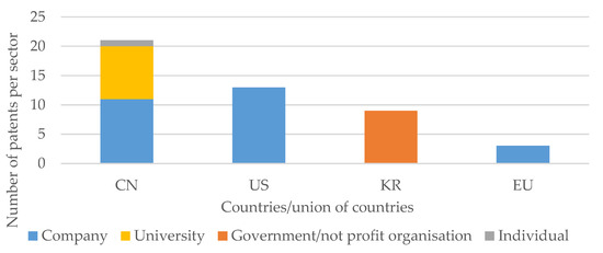 Figure 5 shows the outcome in terms of number of patents granted by applicant sector and by the country of origin of the applicant. The majority of patents (27) come from private companies, while nine are filed by government/not profit organizations, nine from Universities, and one by an individual. China leads with 21 patents, followed by the US (13) and Korea (nine), while there are three patents granted from EU Member States, namely France, the Netherlands, and Spain. Focusing on the sector–country split, it is interesting to observe that all 13 US patents come from the private sector (including six from Hyperloop Technologies Inc. and four from the Boeing company), and all nine Korean patents come from government/non-profit organizations (six from the Korea Railroad Research Institute and three from the Korea Institute of Construction Technology). CRRC Yangtze Co. leads the entities with patents in China with five cases.
