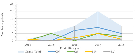 Figure 6 shows the evolution of granted patents in the period 2014–2018, focusing on the first filling year, and divided by the country of origin of the publication author. As can be observed, patent activity passed from five in 2015 to 10 in 2016 and 20 in 2017. It is expected that there are patents filed in 2018 that are not granted yet.