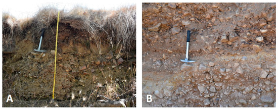 Usually, it is difficult to find the scarps among the different terraces, since many times the topographic steps have a small height (1–2 m) and are normally very degraded. In many times, terrace scarps are nearly buried by the occurrence of wash-slope and debris-slope accumulations adjacent to the scarps. In basis to the texture and grain size of detritic materials incorporated in the fluvial terraces, it is possible to assess that the Yeltes river has sustained a braided fluvial system from its initial stages of development. The stratigraphy of the upper terraces displays numerous interbedded levels of floodplain facies (sands and silts) and gravel bars (quartzite clasts) (Figure 5A). In other outcrops, these braided gravels were originated by a large amount of matrix-less quartzite clasts, within river channels with insufficient capacity of transport, as presently occurs in the present braidplain of the river. This is one of the main reasons for the poor classification and sub-rounded nature of the gravels (Figure 5B) of almost the whole terrace sequence.