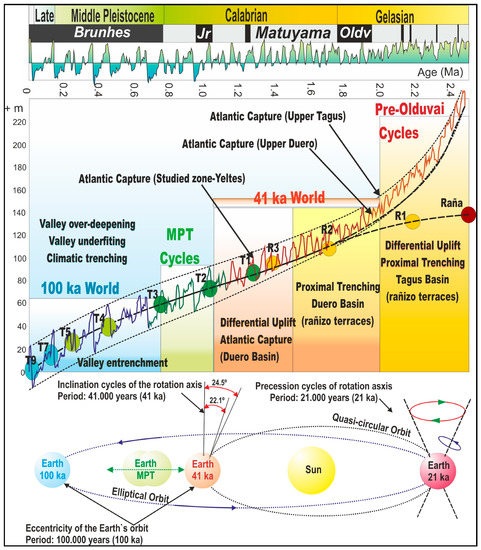 Figure 6 illustrates terrace development of the Yeltes river-valley in relation to the 41 ka and 100 ka worlds defined by the Milankovitch orbital cycles and the so-called “Middle Pleistocene Transition” (MPT) [22,42]. The main curve describes terrace development for central Spain as described by the 3rd Order polynomial curve corresponding to the equation [c] listed in Table 2. In our case, is clear that the oldest rañizo surface (R1) and the raña surface itself show an important deviation from this general chronofuction curve (Figure 6). Since the calculation of these chronofunctions [22] only considered the rañizo terraces described in the Tagus basin, the observed deviation will indicate a younger evolution of the Duero basin in relation to the Tagus one, and therefore a more recent “Atlantic Capture” for the Duero as already suggested by previous authors [22,41]. On the other hand, it seems clear that the climatic control of fluvial terrace development occurs after the MPT, during the 100 ka world (Figure 6). T3 roughly coincides with the end of the MPT and the subsequent development of T4. T5 to T9 is clearly linked to climatic pulses (Figure 6), indicating that from T3 (c. 0.68 Myr) the Atlantic base-level changes could freely propagate upstream Los Arribes and the Huebra canyons towards the studied area. The extreme glaciations and base-level drops (c. ±120 m) depicting the 100 ka world [42] could largely help to eliminate probable internal thresholds working in the past.