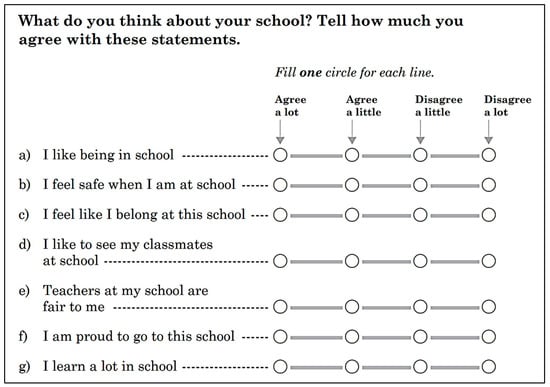 The dependent variable is satisfaction with peer relationships of each student, sourced from four-point Likert item-responses in the TIMSS 2015 Student Questionnaire [45]. Items (a) to (g) state satisfaction with school life in various aspects, and responses (a) to (g) ask students’ degree of agreement—from “Agree a lot” to “Disagree a lot”—on the respective items (see Figure 1).