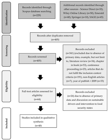 The primary purpose of the eligibility step was to identify further the articles which contain the intended information that can answer the research question and to exclude those that do not. The eligibility process is illustrated according to PRISMA 2009 (Figure 1). Sixty-four articles were further screened for eligibility through the title, abstract, and main contents. A further exclusion was carried out for articles that do not contain explicit discussions of the relationship, drivers, and intervention between food security and sustainability under the context of the food supply chain, and also articles without primary data. Consequently, 24 articles were excluded, leaving only 40 eligible articles to be used for further analysis.