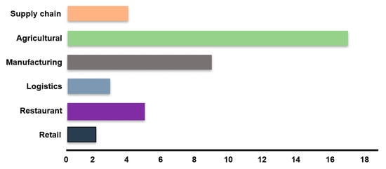 The frequency distribution of the articles, according to the sectors in the FSC, is illustrated in Figure 2. It was observed that 43% of the articles focused on agriculture agendas. This sector certainly evoked the interests of researchers in the sustainable food security system. Next in line were 23% of the articles that comprise research in the manufacturing industry sector, while discussion on retail and logistics lagged far behind with 5% and 8%, respectively.