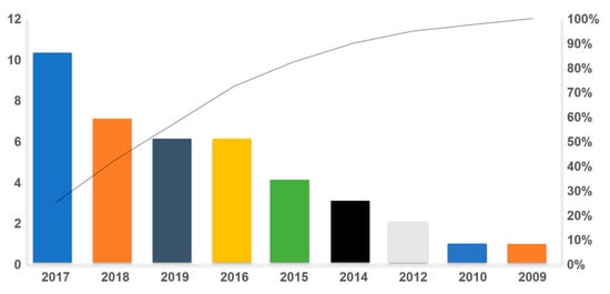 The year of publication frequency is illustrated in a Pareto chart (Figure 3). The y-axis on the left represents the number of papers published. The bar chart is arranged in the order of the highest number of articles to the lowest number of articles, based on the Pareto chart principle. The right-axis and the line represent the cumulative percentage of the published articles, whereas the x-axis represents the year that the articles were published. The line chart is a visual subtool used to depict cumulative percentage to directly spot whether a certain set of data follows the 80/20 rule, moving from left to right across the analysis, to a total of 100%. It was observed that 80% of the articles were published only in recent years (between 2015 to 2019). Thus, it suffices to say that the broach on the sustainable food security system in the FSC is still in its infancy.