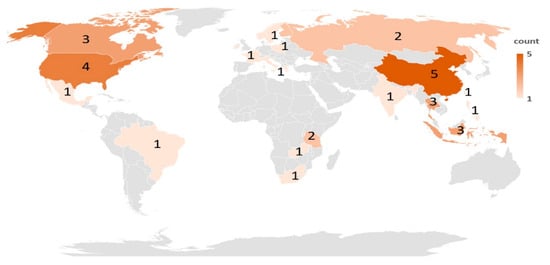 Figure 4 depicts that the interest and proposition of sustainable food security within the FSC was distributed across the globe, including Asia, Europe, North and South America, and Africa. The highest number of our analyzed articles (23%) come from the world’s largest economic countries, like China and the United States of America. Nonetheless, the focus of the studies between these two leading countries was different. Studies from China focused primarily on agricultural agenda, whereas those from the United States of America prioritized on issues about sustainability on food manufacturing, restaurants, and FSC. It is relatively straightforward to envisage that China, as the most populous country in the world, has its focal point on sustainable agricultural agenda as the country itself has more than 1.4 billion people to feed daily. Its population is anticipated to grow continuously, year-by-year [33].