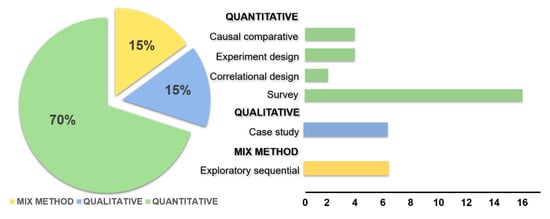 From the research approach and design (Figure 5), 70% of the studies used a quantitative approach, with quantitative survey appearing to be the dominant method used in the nonexperimental design, as compared to other research methods, since the food security state tends to stem from generalizing the individuals’ experiences, household, national, regional, and global level [14]. Meanwhile, 15% of the studies implemented the qualitative approach, predominantly using the case study method. This is because the method allows an in-depth investigation into the implementation of the pragmatic interventions towards the betterment of food security states.