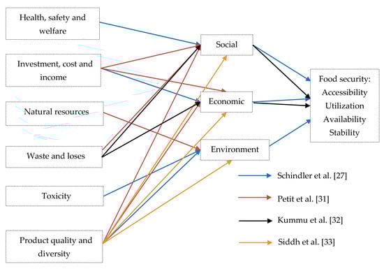 Figure 6 shows the categorization of the sustainability attributes derived from previous studies. These categorizations include employees’ health, safety, and welfare [32], and labor welfare [40]. They were then grouped under the “health, safety, and welfare” category. Other categorizations include agrodiversity [32], finished product quality [40], and internal quality. They were grouped under the “product quality and diversity” category [42]. This visual effect ascribed the challenges of delineating each attribute to the respective triple bottom line domain. Nevertheless, every sustainable domain eventually contributed to the food security state.