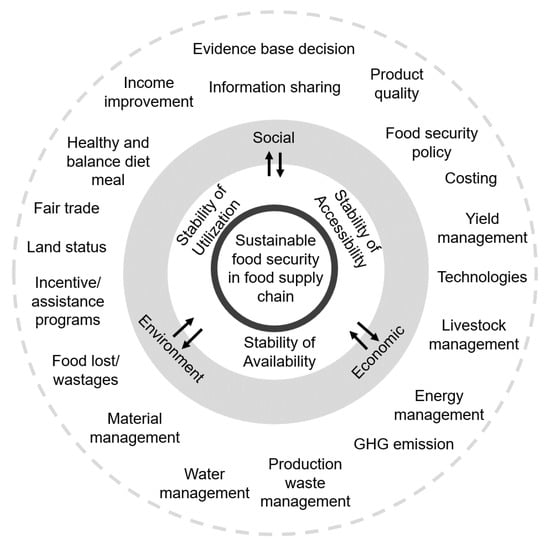 Similarly, labor welfare, investment, and waste and loss rate related to the social domain; finished products’ quality was related to the social and economic domain; costing (including labor and finance) was related to the economics domain; and finally, water, land, air usage, and toxicity were related to the environmental field of sustainability [40]. Nevertheless, the study does not further map the food security domain. Siddh et al. [42], based on grounded theory, showed that the internal quality of perishables had a positive impact on the social, economic, and environmental output of perishables in the FSC. In a study looking at the implications of food waste on sustainability development, Kummu et al. [41] concluded that food waste reduction was affected by economic, political, and social factors, and these would eventually improve the state of food security.