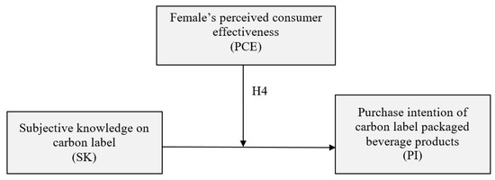 The relationship of Hypotheses 1–3 can be seen in Figure 1, and the relationship between female consumers’ perceived effectiveness on subjective knowledge on carbon labels and the purchase intention is shown in Figure 2.