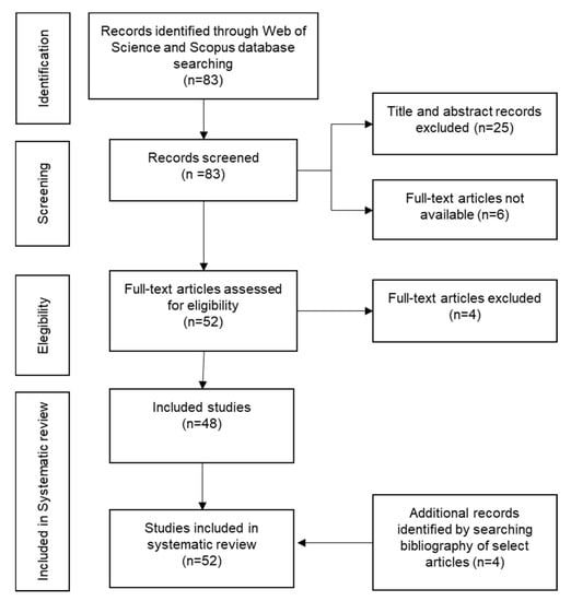 An illustration of the entire study selection process from initial searches and those studies put forward for data extraction and coding is provided in Figure 1. Screening against the inclusion criteria resulted in a final set of 83 documents. The titles and abstracts were checked for relevance; as a result, 25 out of these 83 documents were excluded because they did not address the topic under examination. 6 additional records were excluded because, after an exhaustive search the full text was not accessible. For the remaining 52 references, the full texts were collected and analysed. Another 4 records were excluded after full text reading. However, 4 new records identified by bibliographies of selected articles were included. Finally, a total of 52 records were judged relevant and were selected for the analysis.