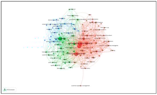 As mentioned before, the co-occurrence of keywords is analyzed through VOSviewer []. In the 218 papers, 1589 keywords were identified, of which 106 were used in the analysis since they fulfilled the requirement of having at least three occurrences. Figure 2 shows the three dominant clusters. The components of each cluster are presented in Table 3. The first cluster (red) is led by Sustainable Development, Customer-Centric Perspective, and Sales, the second cluster (green) enclose Sustainability and Commerce, and the third cluster (blue) encompasses Customer-Centricity and Sustainability Trends.