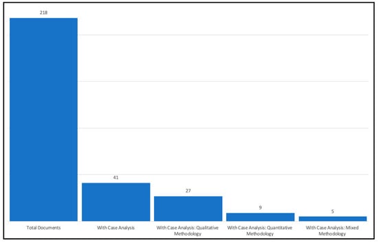 Case studies are very valuable for practitioners as this methodology presents not only how and why things happen, but also the differences between what was planned and what actually occurred in contemporary phenomena []. For this reason, we identified, categorize, and analyze all the case-study research on the 218 documents of the bibliometric analysis. Initially, Figure 6 shows all the case studies according to the methodology implemented. From the 41 case studies founded, 27 cases use a qualitative methodology, 9 use a quantitative methodology, and 5 cases use a mixed methodology.