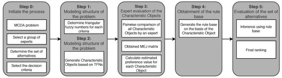 The Characteristic Objects METhod (COMET) is based on fuzzy logic and triangular fuzzy sets. The accuracy of the COMET method was verified in previous works [20,30,62]. The formal notation of the COMET must be recalled based on [63,64,65], and Figure 2 presents the flowchart of the COMET method as summarizing.