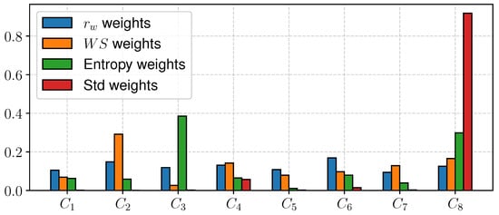 This method is similar to entropy at some point, and assigns small weights to an attribute which has similar values across alternatives. The SD method defined with Equations (50) and (51), where is weight of criteria and is standard deviation [73].