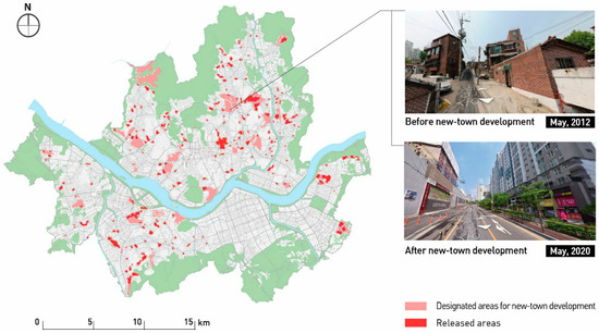 In response to these side effects, the Seoul government announced plans to introduce inner-city redevelopment initiatives in October 2002. The initiatives embraced new in-city town developments in the form of high-rise apartments and cleared away old, low-rise houses, as described in Figure 1. Since these projects were mainly carried out by the private sector, the government’s role in the process of demolition and redevelopment was limited to area designator. With electoral stakes in mind, the government designated areas for the new town development projects. Within ten years, the target areas of the new town development were slated to account for 10% of the total area of Seoul [23,24]. Due to this large designation, many undeveloped areas were suspended in an incomplete state, which raised concerns about vacant housing and crime in these areas.