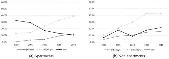 In order to investigate the changes in the ratios of old and new dwelling units classified by housing type, I performed a cross table analysis between housing type and vintage type. Figure 3 shows the changes in the ratios of old and new housing units for apartments and non-apartments, respectively. The left graph shows that the share of old apartments increased from 0.3% in 2000, rose to 3.9% in 2010, and further increased to 12.1% in 2018. Similarly, the share of apartments over 20 years also showed an upward trend from 13.0% in 2000 to 38.9% in 2018. On the other hand, new apartments continued to decrease from 32.4% in 2000, down to 17.1% in 2010, and still further down to 10.4% in 2018. As a result, in 2018, out of 1,679,639 apartment units, the number of old apartments, which accounted for 203,314 units (12.1%), outpaced the number of new apartments, which accounted for 174,339 units (10.4%).