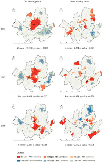 The statistics test whether an area with a high rate of old housing units is surrounded by other areas with high rates of old housing units. The global G statistics for old housing clustering are highly statistically significant, with significance levels of 0.01 for 2000 and 2010, and 0.05 for 2018. Although the ratio of old housing increased from 4.45% to 6.97% between 2000 and 2010, as described in Table 2, spatial autocorrelation was rather relaxed. The degree of spatial clustering for old housing units was recorded at 21.310 in 2005, 9.003 in 2010, and 2.445 in 2018. Meanwhile, new housing units showed relatively weak spatial clustering. The Z score values for new housing clustering were 2.281 in 2000 and 2.092 in 2018 with a significance level of 0.05, while the year 2010 failed to show statistical significance. Despite the assumption that the new housing supply ushered in by the redevelopment process would expand into adjacent communities, and therefore produce spatial clustering [15], this study only shows weak locational clustering patterns within the new housing supply.