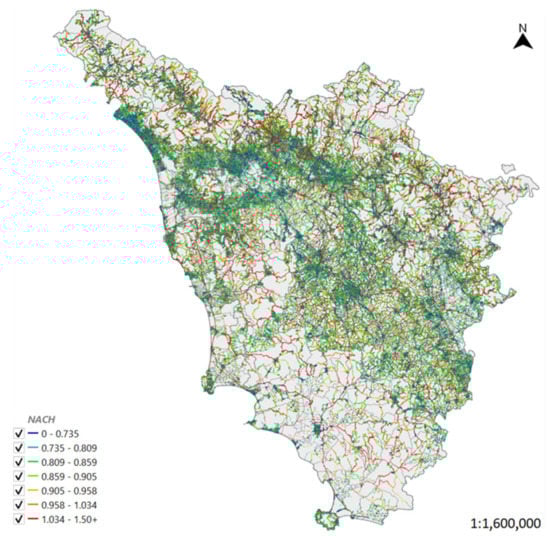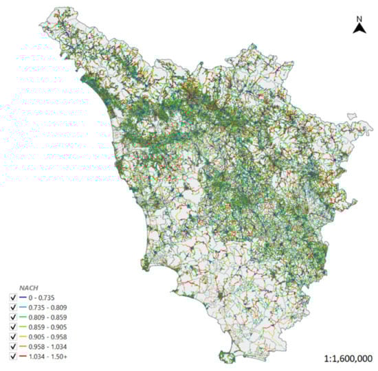 - NACH is a probabilistic index of “movement demand” for a road-network, thus, it highlights preferential routes only considering the overall system configuration, not accounting for real-time conditions, i.e., congestion, travel time. Still, tests indicate significant correspondences amid NACH estimations and real-time movement [].