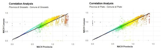 Betweenness Centrality values correlation graphics between Municipal and Provincial NACH models for Grosseto and Prato.