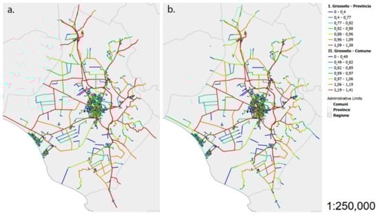 Comparison of Betweenness Centrality hierarchy distribution between the Grosseto Province (Provincia) (a) section and the Grosseto Municipality (Comune) (b) road-circulation network models (NACH).