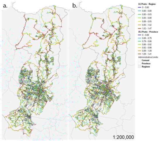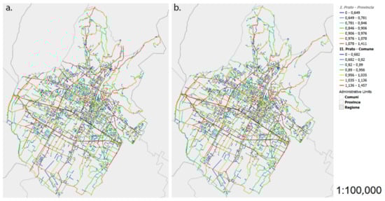 Compared to the previous analyses for region-municipality correlations, the homothetic behavior verified among provinces models and their regional model counterparts is far more noticeable. These regularities are exemplified in the centrality hierarchy distribution of Lucca province—highest correlation—and Prato province—lowest correlation—(Figure 9 and Figure 10), both of which have substantial visual similitudes with their regional model section. Distortions can, however, be visualized and attributed to edge effects, which, while minimal, are the main causes of region-province model NACH value differences. Configurational characteristics are responsible for the overall increases in correlation as, although in greater quantities, due to provinces’ network size, the road-elements near the borders tend to be shorter when compared to their inner continuities, and are also considerably shorter in comparison to the road-segments at the municipality scale, hence these “more compact” systems exhibit a higher degree of homothety.