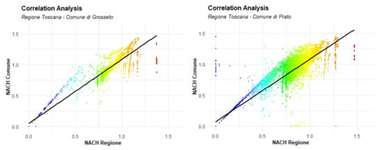 Even though region-municipality correlation averages for r-squared suffer an overall decrease in each province, when compared to their respective pairs from province-municipality correlation averages (Table 3), their values are still within the established threshold (>0.8). These results suggest that the observed homothetic behaviors continue to happen across scales, and with relative regularity, since most values stand substantially close to province-municipality numbers, which indicates that most centrality hierarchy cores tend to maintain placement correspondence. In this aspect, despite value differences, the centrality distribution logics remain quite similar to those verified in the assessment of province-municipality numbers, as correlation graphics conserve their tendencies of linear convergence for lower centrality values and maintain predominant divergent comportments for the higher centrality values. This can also be addressed through the correlation graphic examples for Grosseto and Prato municipalities (Figure 7).