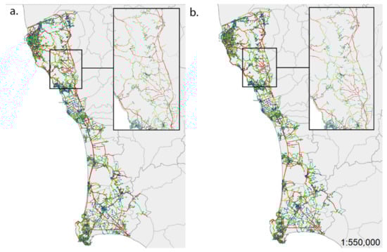 Minimum r-squared values (Table 7), demonstrate that overall lower correlations, especially in the province-municipalities cases, do not deviate much from the 0.8 threshold. When verified, these systems tend to exhibit extensive road-elements near the borders and are more susceptible to edge effects [], that are affected differently depending on their model scale, as can be observed in the Montemignaio municipality (Arezzo province) example (Figure 12).