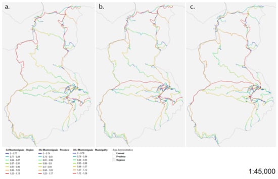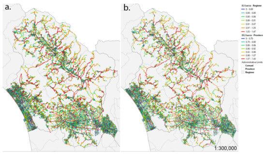 The case of Lucca province, nonetheless, is quite different from the other outliers, because in both comparison scales, the municipalities of Stazzema (Nord) in the region-municipality case, and Seravezza (Nord) for the province-municipality case, exhibit minimum r-squared values that are significantly lower than their pairs. These are in fact very particular situations, because both of these road stretches were modelled as discontinuous parts of the main municipal road-circulation network, due to the fragmented territorial division of the municipalities, as can be observed in Figure 13, since Stazzema (Nord) is a continuity of Seravezza and Seravezza (Nord) a continuity of Stazzema.