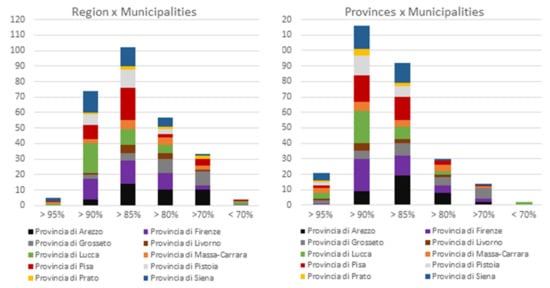 Standard deviations (Table 3 and Table 4) indicate which provinces have wider differences among municipality r-squared values for each scale. These deviations were used to identify eventual discrepancies in homothetic behavior, individuate the outliers, and analyze their particular cases. Overall values, however, tended to be small, which indicates relative concentration of values around the averages and the absence of significant outliers in most cases, thus confirming regularities in behavior. Organizing the data for the municipality correlation degree for both scales in graphics and allocating them to their respective value range aids in the visualization of the instances in which r-squared values are not inside the established correlation threshold (>0.8) (Figure 11).
