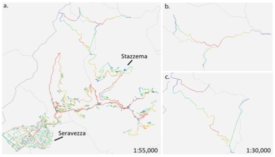 Discontinuities and road-circulation network characterization (a) of Stazzema (Nord) (b) and Seravezza (Nord) (c) Betweenness Centrality models.