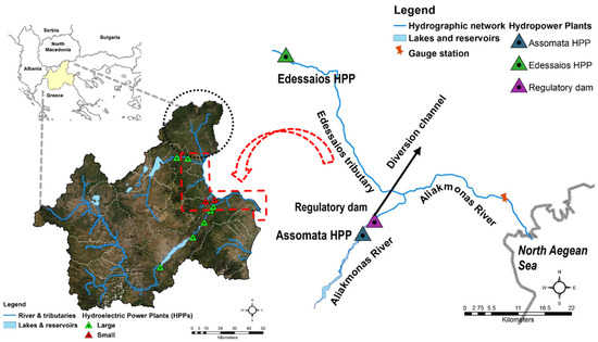 The Aliakmonas river basin with emphasis on the downstream hydropower plants (HPPs) and the river estuaries in the North Aegean Sea.