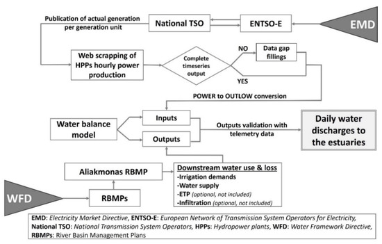 In this study, a methodological guide is presented for the utilization of publicly accessible cloud-based data, through custom-developed data scrapers, for the assessment of dams’ outlets and the downstream water allocation. The cloud-based data regard descriptive information of water usage and tabulated data of hourly power production, obtained from the WFD and EMD implementation processes respectively, for the calculation of near-real-time (data of the previous day) hourly water releases at dammed rivers. After the liberalization of the energy market, the research on this field is focused on the optimization of the day-ahead hydropower production [40] of the water storage [41] and on methods for valuing irrigation water [42]. No relevant research on the combination of energy and water Directives, to the authors’ knowledge, has been conducted. Moreover, the provided methodology for treating the two aforementioned Directives as open access cloud-based databases in order to proceed with the management of dammed rivers is believed as the innovative aspect of the research, with potential operationality to other EU case studies. The promotion of data scraping for harvesting web-based environmental information is also considered an asset of the current research.
