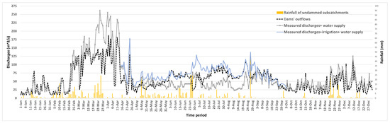 The proposed methodology outputs demonstrate the increased correlation between the measured discharges and the dams’ outflows (R2 = 0.754, RMSE = 0.117) by also taking into account the irrigation and water supply water. The outputs, Figure 3, depict two periods of intense anomalies between the two data sets, such as from the 19th March to 9th April and from the 25th June to 15th of July 2018. In both cases, the water released from the HPP are much lower than the observed ones. The reason behind this is the typical Mediterranean regional spring-summer storms that occurred in the basin’s areas whose waters are discharged directly into the river mainstream. The rainfall time series of these areas, also integrated in Figure 3, support the proposed assumption, since intense rainfalls had occurred for a few days and during the two time periods. In the case of omitting these two short-time periods, there would be a modest improvement of the outputs (R2 = 0.779, RMSE = 0.074).