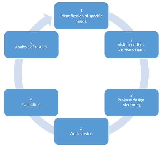 Service-Learning (SL) is a methodology in which the students achieve academic and transversal competences related to a subject while carrying out a service for community benefit [7,8,9,10,11,12,13]. Furthermore, SL is an educational proposal that allows to train in skills and values, promoting an inclusive, active, participatory, and committed education, through a practical experience in a real environment with specific needs, which promotes relationships with community and contributes to the education for citizenship [14,15,16,17]. This methodology can be used as a tool to incorporate contents in the lecture sessions as a way to teach the students about sustainability [18] or to start collaborations about sustainability issues between community partners, local governments and associations [19].