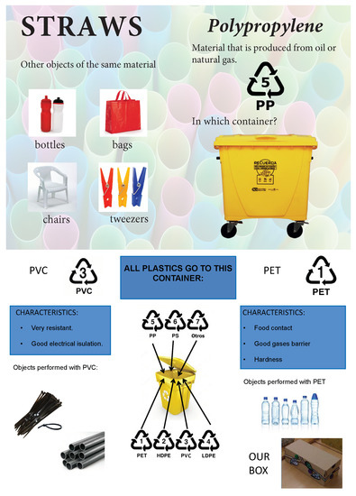 This SL activity has been developed with an entity dedicated to people with Down syndrome. The activity is part of a great entity project called “Put yourself in my shoes” to raise awareness on the general population about the problems that this group must face in their day to day. To carry out this project, each person with Down syndrome has designed their own shoe box with recycled materials supported by the help of the students. Different recycled materials have been used to design the boxes: CDs, straws, bottle caps, soda, and water bottles, cables and so on. Each design has been personalized depending on each user. The students have also designed leaflets explaining the plastic composition of the recycled object (see Figure 3). In addition, some materials with pictograms and simple explanations have been elaborated for those users that could not read (see Figure 4).