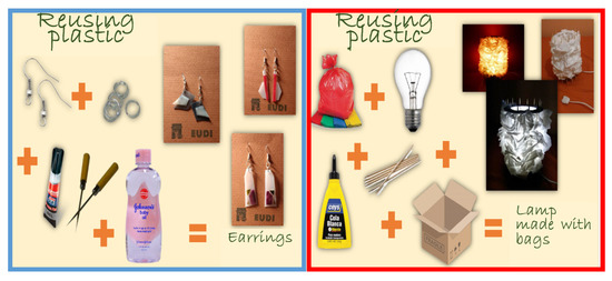 The projects are focused on explaining Physics fundamentals (forces, pressure, density, optical, and so on) and plastic recycling (plastic identification, waste separation or reusing). Figure 5 shows two examples: the first one about plastic waste (water or soda bottles, shampoo or milk bottles, and so on), which are used to design earrings or pendants to be sold in a solidarity market to get money for the entity, while the second example is a lamp made with plastic bags, which is used to explain recycling and basic electricity contents.