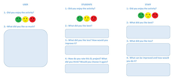 For this purpose, we have elaborated several surveys trying to collect assessments of the experience participants. Therefore, both the students and the beneficiaries of the entity and its own staff carried out their corresponding surveys, always designed by us. Figure 7 shows some questions of these surveys. The first question uses a simple pictogram to obtain an easy and agile answer from all the agents involved in the experience i.e., entity staff, user or service beneficiaries, and the students. The other questions have been chosen to reflect on some aspects of the activity.