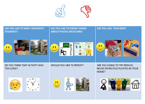 The activity has allowed, on the one hand, to promote the separation, reusing and recycling tasks on these users. In addition, the students and the users learn that there are different types of plastics with also different properties. This activity allows for fostering social relationships between people with Down syndrome and outsiders, which is strongly demanded, especially by young users. On the other hand, as the boxes have been designed within the framework of a project aimed at the general population, it is expected that the “Put yourself in my shoes” campaign will serve not only to raise awareness about the Down syndrome but about the relevance of separating waste at home or about the possibility of giving waste a second life by doing reusing activities.