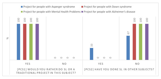 Figure 9 shows the results obtained from the questions and for the initial concerns surveys described in Section 3.1. The graphs show the percentage of response (yes/no) for each question with respect to the total number of responses. We recall that all the students prefer to develop SL projects. About [PCS2], some students in the Technology for Professorship of Higher School subject, corresponding to the project for people with Asperger’s syndrome, have indicated that they have done SL in other signatures. On the other hand, the students of the Physics Fundamentals subject had not developed SL projects in other subjects before. This information is important for the professors to organize the SL activities because it is very important that the students know the objective of the SL activities.