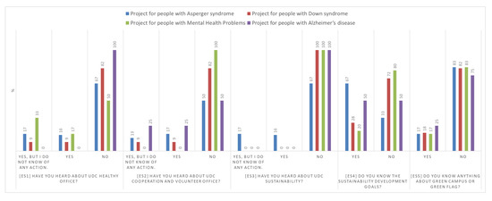 With respect to the environmental survey described in Table 2, Figure 11 shows the corresponding results. From this figure, we can conclude that the students do not have a priori knowledge either about the service in the university working on environmental issues (Green Campus, Green Flag committee), or on volunteering (OCV), or on healthy life (UDC Healthy Office) or about the main measures in terms of sustainability.