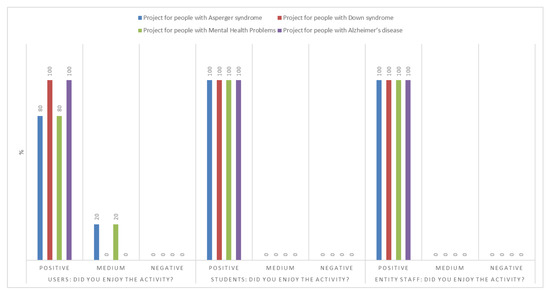 As it was mentioned before in Section 3.5, different surveys have been carried out upon completion of the activity by the students, entity staff, and users. The main results identified for each activity are shown in Figure 12. As it can be seen from this figure, all the students and entity staff were completely satisfied with the activity. The users have indicated a high satisfaction, but there are some answers with a medium qualification.