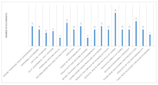In the qualitative analysis, different categories have emerged from the comments of the students in the final surveys and from the student’s diary that have been obtained with the support of the WebQDA software analysis. As Supplementary Materials to this paper, we provide some original comments in Spanish and the translation to English. Figure 13 shows the categories and the number of occurrences of each one of them. These results show the most important learnings and skills achieved by the students, some of them related to environmental competences. For example, we have collected the following comments of our students: