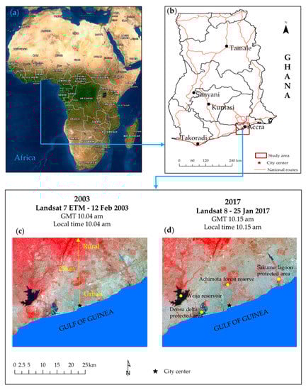 Location of Accra: (a) Ghana and other African countries (Source: Esri ArcGIS online map) [25]; (b) Ghana and the greater Accra area; (c) False color band composite in 2003 (Landsat 7, enhanced thematic mapper—ETM), and (d) False color band composite in 2017 (Landsat 8, operational land imager/thermal infrared sensor—OLI/TIRIS) [26]. Ghana boundary layer was downloaded from DIVA-GIS [27].