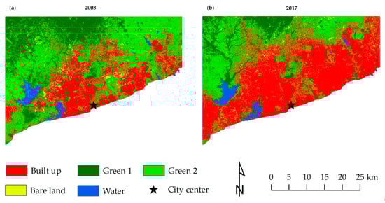 Land use/cover (LUC) maps of Accra: (a) 2003 LUC map; and (b) 2017 LUC map.